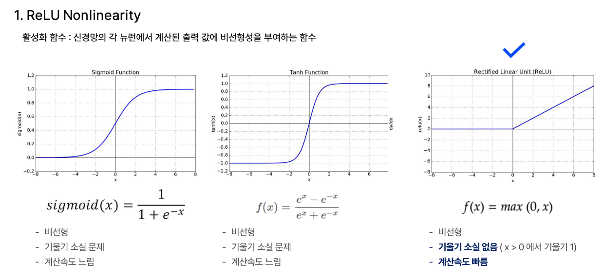 ReLU는 “깊은 모델은 학습이 느리다”라는 전제를 깨기 위한 선택으로 보였다. 시그모이드류의 포화 문제를 피해서, 큰 모델을 “학습 가능한 대상”으로 바꿔 놓는 역할을 했다.